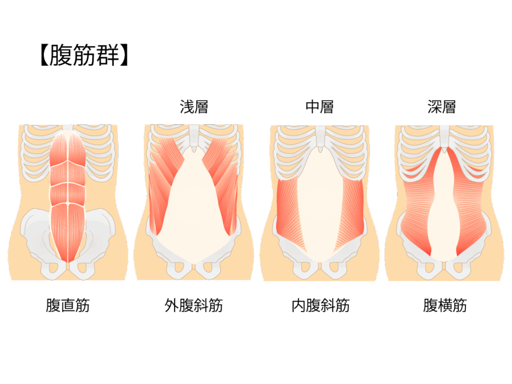 実は腹筋は4層になっており、外側から腹直筋・外腹斜筋・内腹斜筋・腹横筋と筋肉でおおわれています。