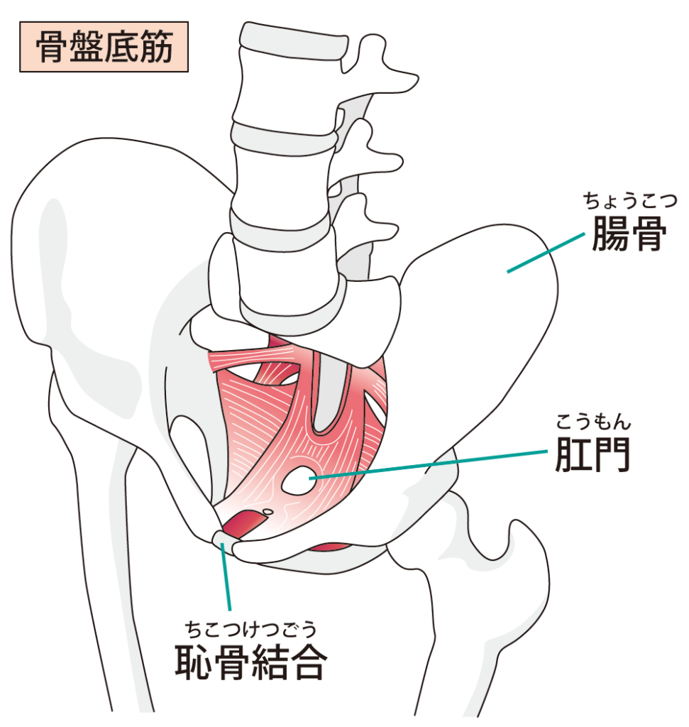 骨盤底筋とは、骨盤の奥で骨盤内臓器を支えている筋肉です。