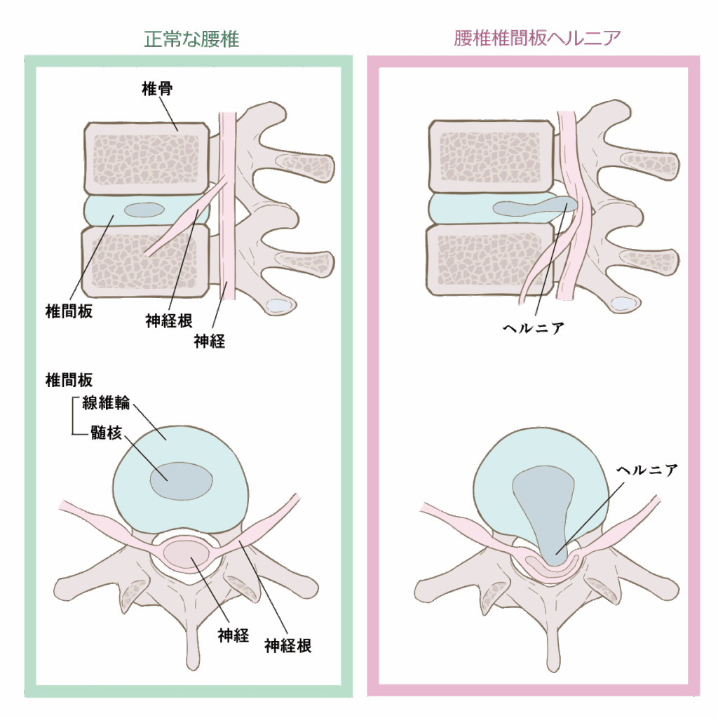 椎間板ヘルニアとは、椎間板が後ろに飛び出てしまった状態のことを言います。これによって神経が圧迫され痛みやしびれを伴うことが多いですが、症状が出ないこともあります。