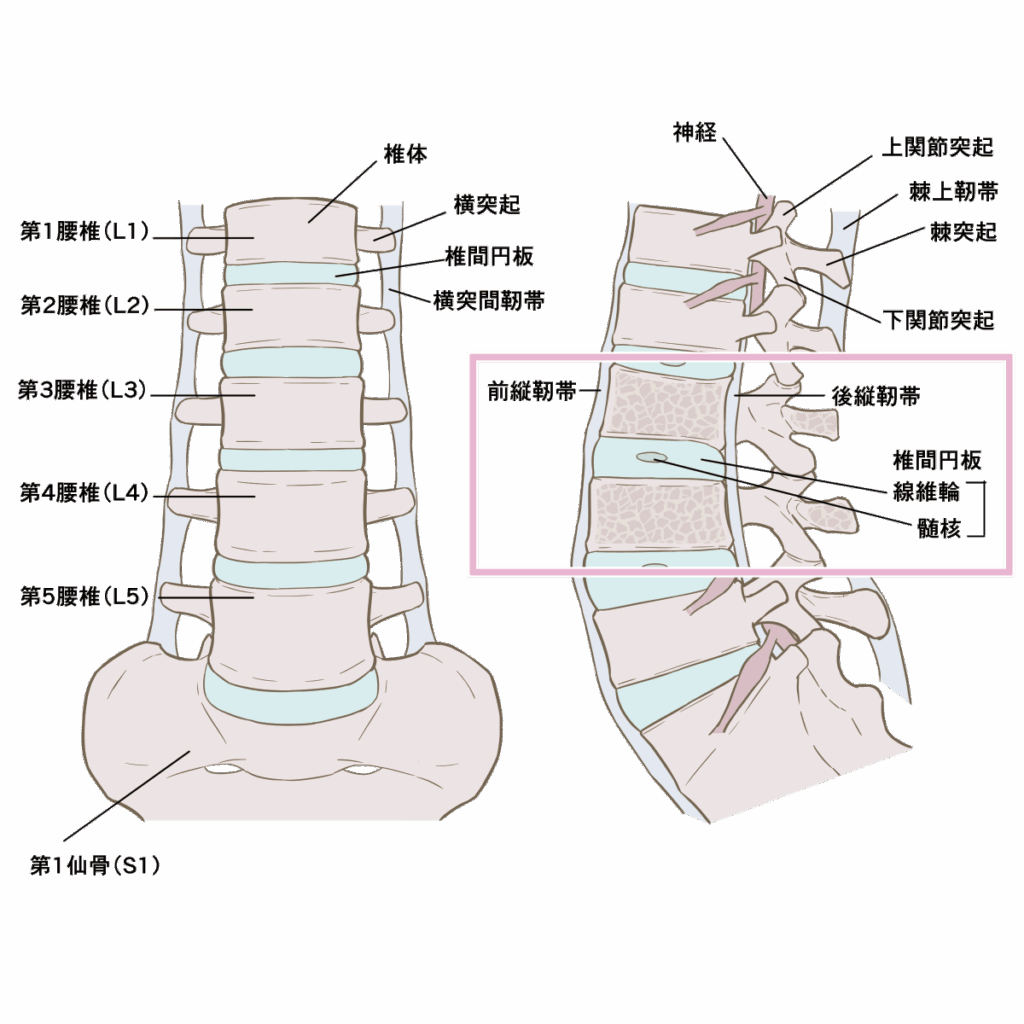 腰椎が積み重なってできている背骨には、負担を和らげるために椎間板というクッションが備わっています。
